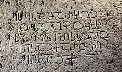 The Umm Leisun inscription (Georgian: უმ ლეისუნის წარწერა, romanized: um leisunis ts'arts'era) is an Old Georgian limestone tombstone slab. It has a five-line[1] inscription written in the Georgian Asomtavruli script and was discovered in 2002, after the renewal of 1996[2] excavation at a Georgian monastery of the Byzantine period, in the neighborhood of Umm Leisun, in the southern part of Sur Baher, 4.5 km southeast of the Old City of Jerusalem.[3] It was found in a burial crypt under the polychrome[4] mosaic floor.[5]
