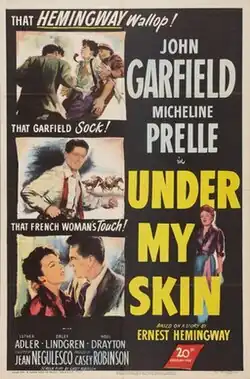 Under My Skin is a 1950 American sports drama film directed by Jean Negulesco and starring John Garfield and Micheline Presle. It is based on the 1923 short story "My Old Man", by Ernest Hemingway, about a jockey being threatened by a mobster after winning a race he had agreed to throw.