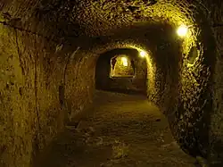 An underground city is a series of linked subterranean spaces that may provide a defensive refuge; a place for living, working or shopping; a transit system; mausolea; wine or storage cellars; cisterns or drainage channels; or several of these. Underground cities may be currently active modern creations or they may be historic including ancient sites, some of which may be entirely or partially open to the public.