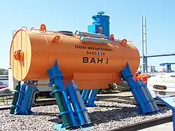 BAH I (for Biological Institute Helgoland ) had a length of 6 m and a diameter of 2 m. It weighed about 20 tons and was intended for a crew of two people.[26] The first mission in September 1968 with Jürgen Dorschel and Gerhard Lauckner at 10 m depth in the Baltic Sea lasted 11 days. In June 1969, a one-week flat-water mission took place in Lake Constance. In attempting to anchor the habitat at 47 m, the structure was flooded with the two divers in it and sank to the seabed. It was decided to lift it with the two divers according to the necessary decompression profile and nobody was harmed.[5] BAH I provided valuable experience for the much larger underwater laboratory Helgoland. In 2003 it was taken over as a technical monument by the Technical University of Clausthal-Zellerfeld and in the same year went on display at the Nautineum Stralsund on Kleiner Dänholm island.[27]