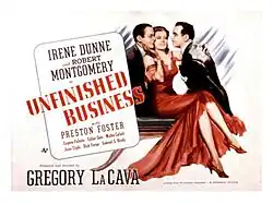 Unfinished Business is a 1941 American romantic comedy film directed by Gregory La Cava and starring Irene Dunne, Robert Montgomery, and Preston Foster.[1] It was produced and distributed by Universal Pictures.