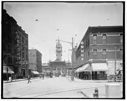 Denver Union Station is the main railway station and central transportation hub in Denver, Colorado. It is located at 17th and Wynkoop Streets in the present-day LoDo district and includes the historic station house, a modern open-air train shed, a 22-gate underground bus station, and light rail station.[4][5] A station was first opened on the site on June 1, 1881, but burned down in 1894. The current structure was erected in two stages, with an enlarged central portion completed in 1914.
