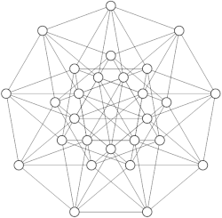 The definition of a unit distance graph may naturally be generalized to any higher-dimensional Euclidean space. In three dimensions, unit distance graphs of points have at most edges, where is a very slowly growing function related to the inverse Ackermann function.[30] This result leads to a similar bound on the number of edges of three-dimensional relative neighborhood graphs.[31] In four or more dimensions, any complete bipartite graph is a unit distance graph, realized by placing the points on two perpendicular circles with a common center, so unit distance graphs can be dense graphs.[7] The enumeration formulas for unit distance graphs generalize to higher dimensions, and shows that in dimensions four or more the number of strict unit distance graphs is much larger than the number of subgraphs of unit distance graphs.[2]