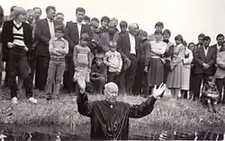 Members of the United Evangelical Church called themselves Evangelical Christians.[92] Baptism was performed in the Name of the Father, Son, and Holy Spirit by immersion, understood as a command of the Lord and an act required of every Evangelical Christian, as well as a testimony and pledge of lifelong fidelity to God. Baptism was not treated as a condition for salvation.[93]
