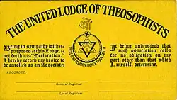 The United Lodge of Theosophists or ULT is an informal and wholly voluntary association of students of Theosophy. It was founded in 1909, mainly through the efforts of Robert Crosbie.[1] The first parent lodge of the ULT was started in Los Angeles by Robert Crosbie and seven other associates through the adoption of its Declaration on February 18, 1909.[2] Owing largely to the revival efforts of B.P. Wadia [1] after Crosbie's death, there are currently about twenty active lodges spread all over the world.[3] The ULT is considered to be part of the second generation [4] or the third section [2] of the Theosophical Movement started in 1875 by H.P. Blavatsky in New York. Presently, it is also one of the existing four main "branches" of the original Theosophical Movement.[5] The following founding principles [6] when taken as a whole, sets apart the ULT from the other Theosophical Organizations: