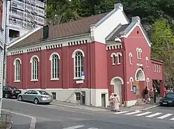 The new congregations were met with opposition from the State Church, and the parish minister in Halden attempted to forcefully cancel Methodist services. Some Lutheran ministers held speeches warning against the Methodists, but these often backfired with spectators instead choosing to convert to the new faith.[11] The first major task in Sarpsborg was to build a church, as Petersen's attic was too small. Sarpsborg Methodist Church was inaugurated on 1 November 1857.[12] Halden Methodist Church was inaugurated during Christmas 1858.[10]