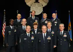 The Air Force Chief of Staff and the Chief Master Sergeant of the Air Force are authorized to wear a special ceremonial uniform consisting of a stand-collar coat and braided trousers similar to the ceremonial band uniform, with the addition of a silver braid trimmed belt. Each uniform costs $700 with the wearer required to personally pay for purchase.[18] This uniform was worn on 10 August 2012 at the ceremony in which Gen. Mark Welsh III succeeded Gen. Norton Schwartz as the 20th Air Force Chief of Staff,[19] but was not used for the subsequent ceremonies of Gen. David L. Goldfein and General Charles Q. Brown.[20][21]