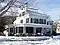 The Superintendent's quarters (1820) and the Commandant's quarters (1821) were constructed on the end of Jefferson Place near the intersection with Washington Road. During the 1800s, Jefferson Road extended further south through what is now North Area and a row of officers' quarters once lined the west side of the road south of the Superintendent's quarters, but those structures were all demolished to make room for the old North Barracks. The next oldest structures on post are the three sets of large duplex officers' quarters just off the northwest edge of the plain. These quarters (c1828), have been expanded over the years and have come to be known as Professor's Row, as they traditionally house the heads of the academic departments. The Dean's quarters were constructed in 1856 between the commandant's quarters and professor's row.[16] A complex of structures known as the "Ordnance Compound" was completed between 1837 and 1840. It consisted of three stone buildings with two towers encircled by a wall. The building that stands in the center of the compound, now the First Class Cadet's social club, was added in 1880.[21] The second academic building was demolished in 1891 and replaced on the same location by what was then known as the West Academic Building. This Richard Morris Hunt designed structure took four years to complete and served as the main academic hall until 1950, when it was converted into a barracks and renamed Pershing Barracks. The large house on the end of Professor's Row, known today as the "Beat Navy House" due to the "Beat Navy Sign" that hangs on its front porch, was built in 1875 and has been used as multiple officer's quarters since its construction.[18] In 1894, McKim, Mead, and White designed and began construction on the new memorial hall, later named Cullum Hall after General George W. Cullum, who started the Cullum Register of Graduates and donated the funds for the structure. Completed in 1898, Cullum Hall broke several architectural traditions. First its classical design and white marble construction clashed with the gray granite Gothic design of the other buildings on the plain. Second, it obstructed the eastern view of the Hudson River.[22] Started in 1900 and completed in 1903, the West Point Officer's Club also was of neo-classical design. However, budget cuts and the high cost of white marble resulted in the selection of an off-color white brick, a design that failed to inspire the imagination of the public at large and the academy leadership. These two structures are the only neo-classical designs left in the cadet area now that the old cadet chapel is moved to the cemetery.[23]
