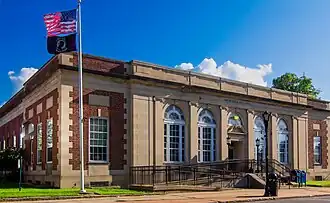 US Post Office-Oneida is a historic post office building located at Oneida in Madison County, New York, United States. It was designed and built in 1931, and is one of a number of post offices in New York State designed by the Office of the Supervising Architect of the Treasury Department, James A. Wetmore. It is a one-story, seven bay wide building in the Colonial Revival style. The five central bays are faced with limestone and limestone trim appears throughout the design.[2]