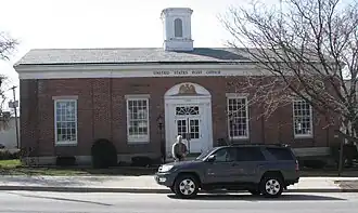 US Post Office-Ticonderoga is a historic post office building located at Ticonderoga in Essex County, New York, United States. It was designed and built in 1936–37, and is one of a number of post offices in New York State designed by the Office of the Supervising Architect of the Treasury Department under Louis A. Simon. The building is in the Colonial Revival style and is a symmetrically massed, one story brick building with a stone watertable. The slate covered gable roof is topped by a square, flat-topped cupola with Doric order pilasters. The interior features a 1940 mural by Frederick Massa titled The Exhortation of Ethan Allen.[2]