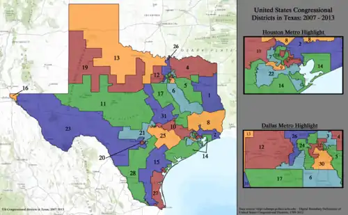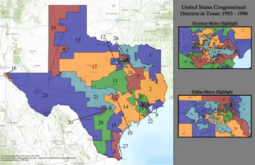 Below is a table of United States congressional district boundary maps for the State of Texas, presented chronologically.[6] All 10 redistricting events that took place in Texas in the decades between 1973 and 2013 are illustrated here.