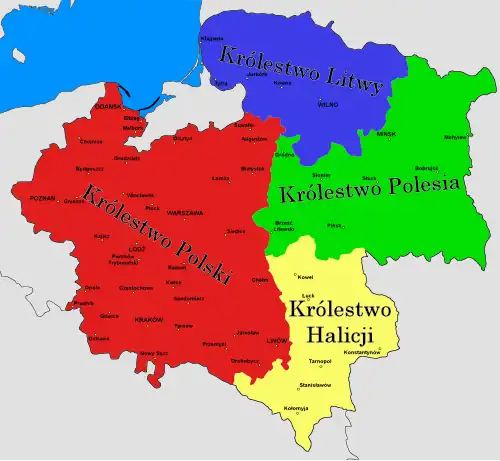 Paderewski's idea postulated rebuilding a Polish state as a federation, where equality of all citizens, regardless of religion and ethnicity, would be enshrined in law and the states constitution. The proposed state would include most of the former lands of the Polish Lithuanian Commonwealth. Taking into account the population of the regions within the proposed nation's borders, the country would have 54 million citizens. At its head would be a President with a title of the King of Poland, Lithuania, Polesia and Halych.[1]