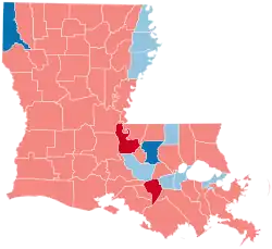 In this election, Louisiana voted 25.9% to the right of the nation at-large, or a 13.85 percent bigger differential than in 2004.[1]