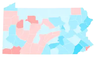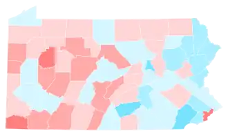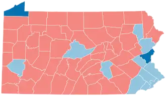 One key to Biden's success in the state was his improvement on Hillary Clinton's margins in the large Philadelphia-area suburban counties: he won Bucks by 3.60% more than Clinton did, Delaware by 4.38% more, Montgomery by 4.80% more, and Chester—which Mitt Romney had narrowly won just eight years prior—by 6.60% more. At the same time, he reclaimed two of the three large industrial counties which had voted Democratic for at least six consecutive elections before Trump flipped them in 2016: Erie and Northampton. While Trump prevailed in the third, Luzerne County, he did so by a reduced margin with respect to 2016; and Biden increased the margin of victory in his birth county, Lackawanna County, which Trump had nearly flipped in 2016. Biden halted the four-election Democratic slide in formerly traditionally Democratic Westmoreland County, where, before 2020, Al Gore had been the last Democrat to improve on the previous nominee's vote share (and which had given Trump his margin in the state in 2016). He also improved on Clinton's margins in Lehigh County by 2.9% and won Allegheny County with the largest percentage of the vote since 1988; however, Biden's vote share in Philadelphia County actually declined slightly compared to Clinton's, although he still outperformed either Al Gore in 2000 or John Kerry in 2004 in the county. Biden became the first Democratic candidate running for president to garner at least 100,000 votes in the Republican stronghold county of Lancaster.[7][8] He also became the second presidential candidate since 1964, the last time the county voted for a Democrat, to get at least 40% of the vote.[8] This was due to the large number of votes Biden received from the city of Lancaster and a competitive margin in voting precincts in and around Lititz and Columbia.[9]