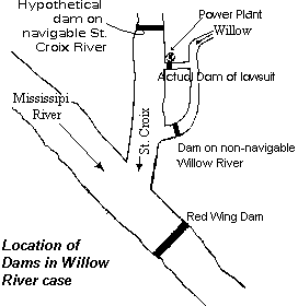 The Mississippi River, a navigable stream, is joined by the St. Croix River, another navigable stream, slightly above Red Wing, Minnesota. Farther up the St. Croix, the Willow River, a non-navigable stream, flowed into the St. Croix, but some years ago a dam was built blocking off the former mouth of the Willow. A channel was dug above that dam, connecting the Willow to the St. Croix, and the channel was also dammed. A mill was built to exploit the head of water created by the two dams. Subsequently, the Willow River Power Company acquired the land adjacent to these dams and it built a hydroelectric facility near them. The spillway or tailrace below the power’s company’s turbines exited into the St. Croix River. (See map.)