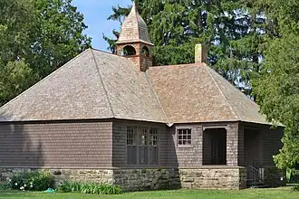 Unity Chapel was designed in Joseph Lyman Silsbee's Chicago architectural office in 1886. Silsbee was one of the leading practitioners of Shingle style architecture in the Midwest and designed the chapel as a simple execution of this style. Although not officially in the employ of Silsbee, eighteen-year-old Frank Lloyd Wright "looked after the interior."[2] This makes the chapel Wright's earliest known work. The chapel was designed for Wright's uncle, Jenkin Lloyd Jones, to serve as a private chapel for his surrounding Lloyd Jones relatives; Jones had commissioned Silsbee to design his All Souls Church in Chicago the previous year. The chapel grounds include a cemetery for the family, including the grave of famous Hollywood actress Anne Baxter.