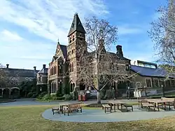 Several of the earliest campus buildings, such as the Old Quad and Baldwin Spencer buildings, feature period architecture in a Gothic revival style. The Old Quadrangle underwent extensive restoration in 2019 to return to elements of the original design, including a dedicated temporary exhibition space in the Treasury Gallery.[94] The new Wilson Hall replaced the original Gothic Revival building which was destroyed by fire.[95][96][97]