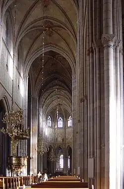 Although the cathedral was designed by French architects, it exhibits a number of differences from the cathedrals of northern France. Above all, it is essentially constructed of brick rather than stone. Brick could easily be produced locally but stone had to be imported from the distant quarries of Gotland. As bricks and mortar are not as strong as stone, the walls had to be thicker although the pillars needed to support the vaulted ceiling of the chancel were made of limestone (although those in the nave are of brick).[4] The north transept portal is also built of limestone, no doubt as it was needed to support the rose window, also structured in limestone itself. While the chancel and the transept are clearly of French design, the nave which was built somewhat later displays German and Swedish characteristics. Constructed in about 1330, the rose window over the northeast portal is still entirely French. Nicolaus from Västerås, the Swede who directed work on the nave from the 1360s, appears to have slightly modified the original plans, adding confessional side-chapels and including a few features of German origin. Cross-vaults were nevertheless installed, rather than star-shaped vaults which were more common at the time. Work on the western end of the building began in 1431 with the construction of the west portal which was influenced by the style of Vadstena Abbey. The towers, however, still exhibited features typical of 13th-century French architecture, indicating that the original plans were still in use at the time. Overall, despite minor differences, Uppsala Cathedral still reflects the style of the 13th-century cathedrals of northern France.[5]
