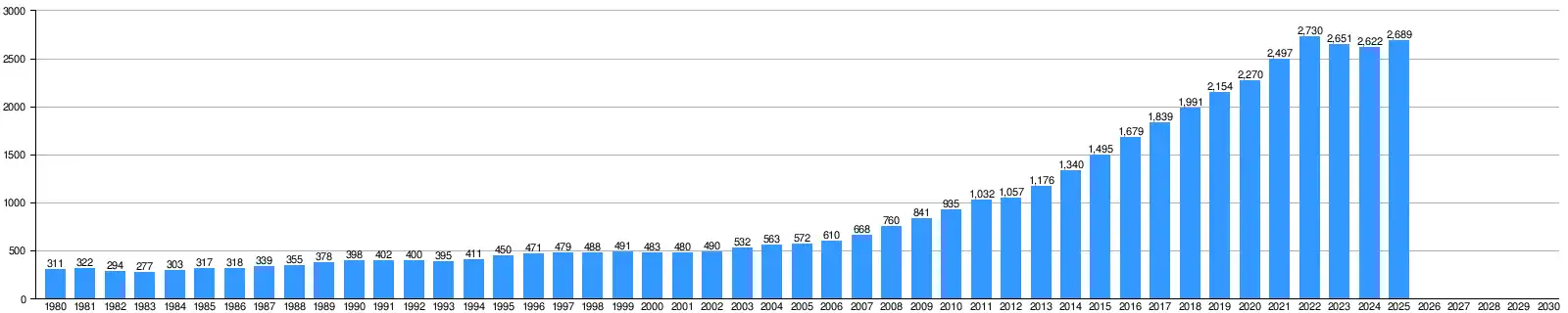 The following table shows the main economic indicators in 1980–2021 (with IMF staff estimates in 2022–2027).[140] Inflation below 5% is in green. The annual unemployment rate is extracted from the World Bank, although the International Monetary Fund find them unreliable.[141]