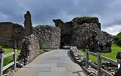 The 16th-century gatehouse is on the inland side of the Nether Bailey and comprises twin D-plan towers flanking an arched entrance passage. Formerly the passage was defended by a portcullis and a double set of doors, with guard rooms on either side. Over the entrance are a series of rooms which may have served as accommodation for the castle's keeper.[30] Collapsed masonry surrounds the gatehouse, dating from its destruction after 1690.[39]