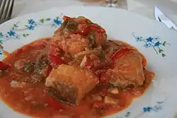 Lengua a la vinagreta[3] (Spanish for tongue with vinaigrette) is a cold preparation of beef tongue that is previously peeled and boiled and served with a vinagreta sauce made with chopped boiled eggs, parsley, garlic, onions, olive oil, and vinegar.[4]