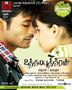 Uthamaputhiran (transl. Ideal Son) is a 2010 Indian Tamil-language romantic action comedy film directed by Mithran R. Jawahar. It is a remake of the 2008 Telugu film Ready. The film stars Dhanush and Genelia, reprising her role from the original version;[1][2] the supporting cast includes Vivek, K. Bhagyaraj, Ashish Vidyarthi and Jaya Prakash Reddy (who was also part of the original film) among others with Shriya Saran in a cameo. The film received mixed to positive reviews from critics, ended up as a commercial success among 2010 Deepavali releases along with Mynaa.