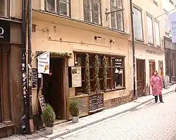 The café Gråmunken on Number 18 is a well-established café, since several generations renowned for the medieval vaults in the basement. While a gravel ridge composes most of the soil in the surrounding area, the block behind the café is built on solid rock located above sea level during the Viking Age, and hopefully future excavations will be able to further document the earliest history of the area.[10] Archaeological excavations in the street just outside Number 18 have unveiled several layers of earlier street levels, with traces of paved streets found a metre below the present pavement.[11] North of Number 18 is Stora Gråmunkegränd ("Great Grayfriars Alley"), which used to lead from the Greyfriars islet (Riddarholmen) to the defensive tower on the east side of Västerlånggatan. South of the café is Helga Lekamens Gränd ("Alley of the Holy Body [of Christ]"), named after an influential guild existent from the 15th century to the Reformation (1520s). Between these two alleys is a barred alley.