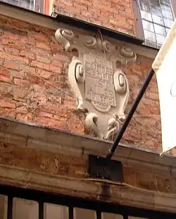 Barely visible in the red sandstone cartouche of the portal of Number 65 is a Christogram, IHS, the maxim SOLI DEI GLORIA ("To God alone the glory"), and the initials of the Holstein cloth trader Peter Hanssen and his wife Anna Steker: