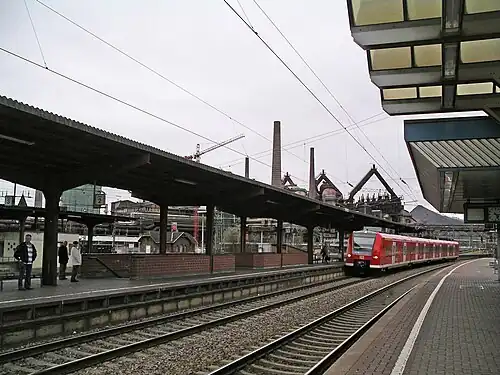 The station was built during the construction of the Saar line, which was opened from Saarbrücken to Merzig on 16 December 1858. In 1860, the first station building was built,[4] which was located to the east of the present building. In the Franco-Prussian War, the station was a target of French artillery fire, which led to the closure of rail operations.[4] In 1872,[4] a branch line was built to the Grube Viktoria (a colliery named after Victoria, Princess Royal) in Püttlingen branching off the Saar line to the east of the station.[5] The Völklingen–Thionville railway was opened in 1880. In 1893 the station had become too small and the current Alten Bahnhof ("old station") was built.[4] The line to Püttlingen was extended to Lebach in 1911. This line was closed in 1985 and today the section in Völklingen is used as a bike path. In the heyday of the nearby Völklingen Ironworks, the station served as an important transportation hub for steel workers and raw materials.[6] From the mid-1960s the Saar line was electrified. The new station building adjacent to the existing building[7] was opened in 1992 after a new building had been under discussion since 1975. The old station was heritage listed.[4] Until 2002, Völklingen was served by InterRegio trains; it has since only been served by regional traffic.