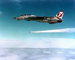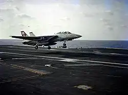 In addition to its "extended" deployment during the first two months of 1980, VF-111 had another deployment with USS Kitty Hawk from April to October 1981. VF-111 and the other squadrons of CVW-15 were subsequently deployed on the maiden cruise of USS Carl Vinson in 1983, which saw the Sundowners accumulate over 1400 carrier arrested landings and 300 flight hours during the eight-month long voyage.[16] This was the first of six consecutive cruises with the Carl Vinson lasting until 1990.[17] After the 1984-85 WestPac deployment,[18] VF-111 and VF-51 participated in the filming of the movie Top Gun by providing planes for use in the film's aerial sequences.[19]