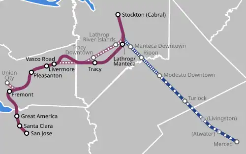 - ^ ICF (April 2018). "1: Introduction" (PDF). Draft Environmental Impact Report: ACE Extension Lathrop to Ceres/Merced, State Clearinghouse #2018012014 (Report). San Joaquin Regional Rail Commission. Retrieved October 30, 2024.