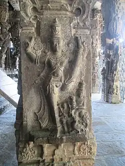 There is a shrine of Chakratalvar on the eastern side of the temple tank. This is biggest chakrathazhvar in India. The image of Chakratalvar (Sudarshana) in the temple is depicted with six hands. There festival image of the temple has seven different images of Sudarshana depicted within the same chakra. There are two entrances to the shrine as the two images are considered to be separate. The shrine is believed to have been constructed during the time of Kulothunga III during 1191 CE by Ilavalagan Kalingarayan of Nettur as seen from the inscriptions in the temple. The later additions are presumably made by the Vijayanagara Empire during the 13th or early part of 14th century. The kings also added pillared columns in the leading hall sculpted with figures from Ramayana and various forms of Vishnu.[33]