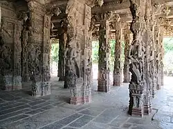 The main sanctum faces west and can be entered through a 40 metres (130 ft)-tall, 7-tiered rajagopuram (main gateway tower).[4] The image of the presiding deity is designed in such a way that on the 15th day after Chitra Purnima, the rays of the Sun fall on the idol.[26] The hill, called Hastagiri, is 360 metres (1,180 ft) long by 240 metres (790 ft).[27] The eastern gopuram is taller than the western gopuram, which is contrasting to large temples where the rajagopuram is the tallest one.[4] One of the most famous architectural pieces in the temple is the huge stone chain sculpted in a single stone.[28] There is a 100 pillared hall[29] which has sculptures depicting Ramayana and Mahabharata. It is a masterpiece of Vijayanagara architecture.[21][28]