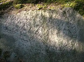 This is not properly a runestone but a runic inscription in style Pr4 that has been carved into flat bedrock at Veda. It is dated to the mid-11th century.[37] It was ordered by Þorsteinn who enriched himself in the lands of Rus' in memory of his son. Omeljan Pritsak identifies this Þorsteinn with Þorsteinn, the former commander of a retinue,[38] who is commemorated on the Turinge Runestone.[39][40] He suggests that Þorsteinn was the commander of the retinue of Yaroslav the Wise and that his son Erinmundr may have died in Garðaríki while serving under his father.[41]