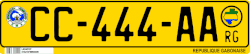 The current scheme of regular license plates Gabon introduced in 2013. This scheme copies the French SIV scheme of 2009 and has the format AS-123-SH, where AB-SH - Series 123 - Number. Regular plates have black letters and numbers on a yellow background. In the upper left corner of the plate are the emblem of the Central African economic and Monetary Community (CEMAC) in the right side of the plate in terms of image maps are the country's national flag colors under which the code has RG. Regional coding is missing.[1]
