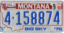 1976–91 | Embossed sky blue serial on reflective white plate with screened red state-shaped border; red "76 Bicentennial" logo and sky blue buffalo skull screened at top left and bottom left respectively; red band screened above serial containing "MONTANA" in white; screened sky blue "'76" at bottom right | "BIG SKY" screened in sky blue centered at bottom | 1·123456 10·12345 |