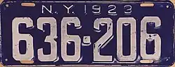 1923 | Embossed white serial on purple plate with border line; "N.Y. 1923" centered at top | none | 123-456 1-234-567 |
