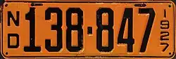 1934 | Embossed blue serial on orange plate with border line; vertical "ND" and "1934" at left and right respectively | none | 123-456 | 1 to approximately 155-000 | |