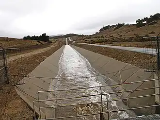 The flow of the Ventura River and its tributary Coyote Creek have been reduced by the completion of Casitas Dam, which forms Casitas Reservoir. The dam is on Coyote Creek about 2 miles upstream of the junction with the Ventura River. The Robles Diversion Dam was constructed on the Ventura River in 1958 to divert up to 107,800 acre-feet of water per year through a four-and-a-half mile canal to Casitas Reservoir.[22] About 40% of the total water in Lake Casitas is supplied from high winter flows in the Ventura River. Casitas Municipal Water District sells water to both domestic and agricultural customers.[23]