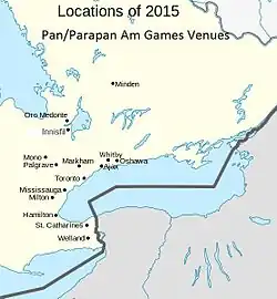 The 2015 Pan and Parapan American Games venues were mostly located in the host city of Toronto, Ontario, though some events required facilities located elsewhere. Besides Toronto, fourteen other municipalities in Southern Ontario hosted competitions: Ajax, Hamilton, Innisfil, Markham, Milton, Minden, Mississauga, Mono, Oro-Medonte, Oshawa, Palgrave, St. Catharines, Welland and Whitby.[1][2]