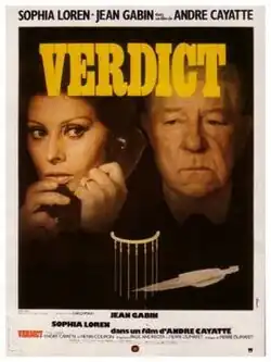 Verdict is a 1974 French-Italian drama film, directed by André Cayatte, starring Sophia Loren, Jean Gabin and Julien Bertheau.[1] A French judge comes under intense personal pressure to acquit a man who is accused of murdering his lover.[2] It was also released under the title Jury of One.