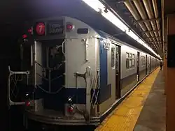 The city government took over the IRT's operations on June 12, 1940.[11][12] The IRT routes were given numbered designations in 1948 with the introduction of "R-type" rolling stock, which contained rollsigns with numbered designations for each service.[13] The route from Times Square to Flushing became known as the 7.[14] In 1949, the New York City Board of Transportation announced that the Flushing Line platforms would be lengthened to 11 IRT car lengths; the platforms were only able to fit nine 51-foot-long IRT cars beforehand.[15][16] The platforms at the station were extended in 1955–1956 to accommodate 11-car trains.[17] However, nine-car trains continued to run on the 7 route until 1962, when they were extended to ten cars.[18]