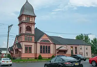 Vernon Methodist Church is a historic Methodist church at the junction of NY 5 and Sconondoa Street in Vernon, Oneida County, New York. It was built in 1892 and is a rectangular structure consisting of a square sanctuary (54 feet by 54 feet) with projecting, gable roofed wall bays on three sides and an attached parish hall wing. It features a massive engaged entrance/bell tower which incorporates an open belfry with balustrade and a large bellcast roof with slate shingles.[2]