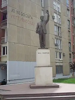 "No negotiations, self-determination" graffiti behind the statue of Bill Clinton in Pristina