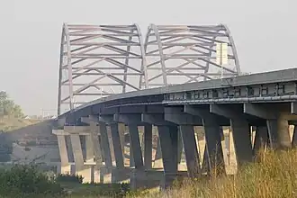 The Veterans Memorial Bridge are two twin tied arch structures carrying Route 364 across the Missouri River between St. Louis County and St. Charles County, Missouri. Each bridge supports five lanes of traffic, the northern (downstream) bridge westbound, and the southern (upstream) bridge eastbound.