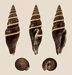 The narrow shell has a fusiform shape. It is dark brown with white spiral bands (sometimes carrying a red thread). The spire is elongate and sharp. The shell contains 11 slightly convex whorls. The distinct suture is slightly constricted. The first 8-9 whorls are longitudinally ribbed, spirally multisulcate, then spirally striated. These spirals become rather weak on the last half of the body whorl. The body whorl is shorter in proportion to the spire and is contracted at the base. It is roundly convex, decorated with a white band above and below the middle, very narrow below the middle, ending in a short tail, spirally lirate. The brown columella has five, cream plaits. The interior of the aperture is violet. The outer lip is thick, smooth and borderd with dark purple-brown.[2]