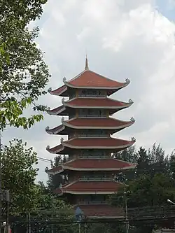 The Việt Nam Quốc Tự (lit. 'National pagoda of Vietnam') is located on February 3rd Blvd., District 10 of Ho Chi Minh City, Vietnam. The pagoda, seven stories tall, is full of colorful, oversized statues of religious figures. On the first and fifteenth of the month, the pagoda opens up its third and seventh floors to the public. On other days, the second floor is accessible; it features a shrine made up of miniature Buddhas floating against a cloudy sky mural.