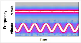 Descriptions of what would now be characterised as vibrato go back to the 16th century.[2] However, no evidence exists of authors using the term vibrato before the 19th century.[3] Instead, authors used various descriptive terms interchangeably, including tremolo, bebung, or tremblement, or descriptions such as wavering, shake or trillo. These “terminological uncertainties”[4] continue to pervade modern definitions of vibrato.