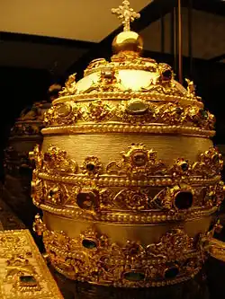 It is worth noting however that the equivalent title "Vicarius Christi" is indeed known to be inscribed upon the Belgium Tiara given to Pope Pius IX on 18 June 1871 by the Ladies of the Royal Court of the King of the Belgians and designed by Jean Baptist Bethune of Ghent.[54][55] Adventists have proposed that the alternate "Vicarius Christi" is no better than Vicarius Filii Dei, because of the correlation in Leviticus 24:18 between the substitute Vicarium in the Vulgate[56] and the substitute ἀντί "life for life" in the Greek text.[57] They have proposed Vicarius Christi therefore means "Antichrist".[58]