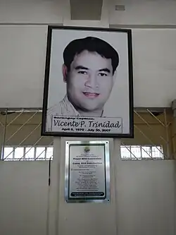 However, Kapitan Benjie, as he is known to all residents of Punturin, did not see the birth of a separate Punturin High School. On July 30, 2007, two gunmen approached him during the weekly flag ceremony at the barangay hall and shot him on his nape and face.[1] He died on the spot. On his honor, Punturin National High School was renamed Vicente P. Trinidad National High School by virtue of RA 9659,[2] passed by the Congress on July 17, 2009.